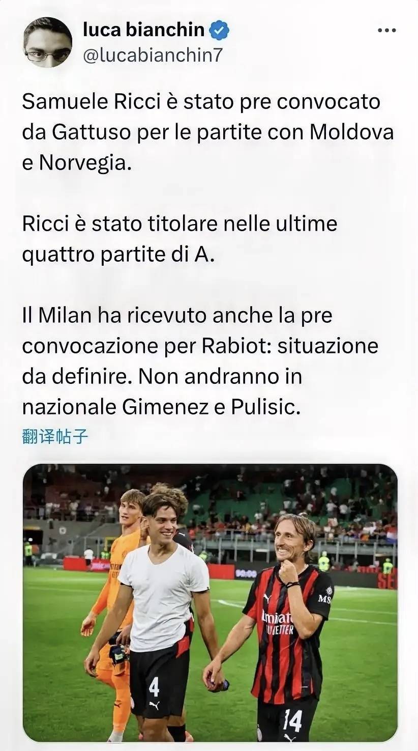 意甲:里奇入选意大利国家队,过去四场联赛,他均代表米兰首发出场且表现出色