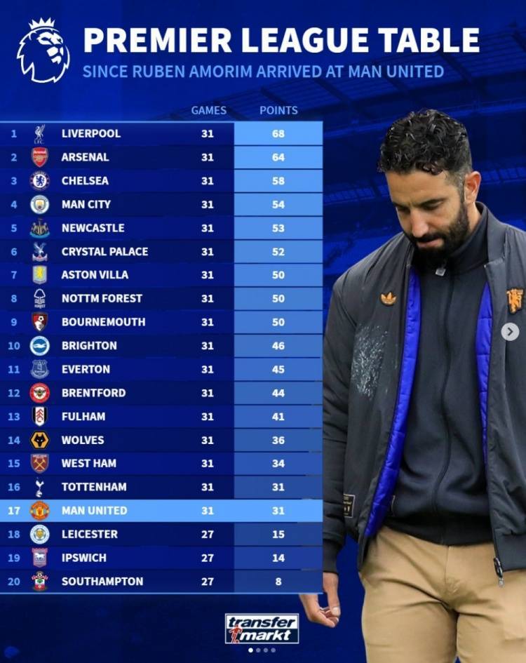 德转列阿莫林执教曼联英超战绩,31轮31分仅高于上赛季三支降级队